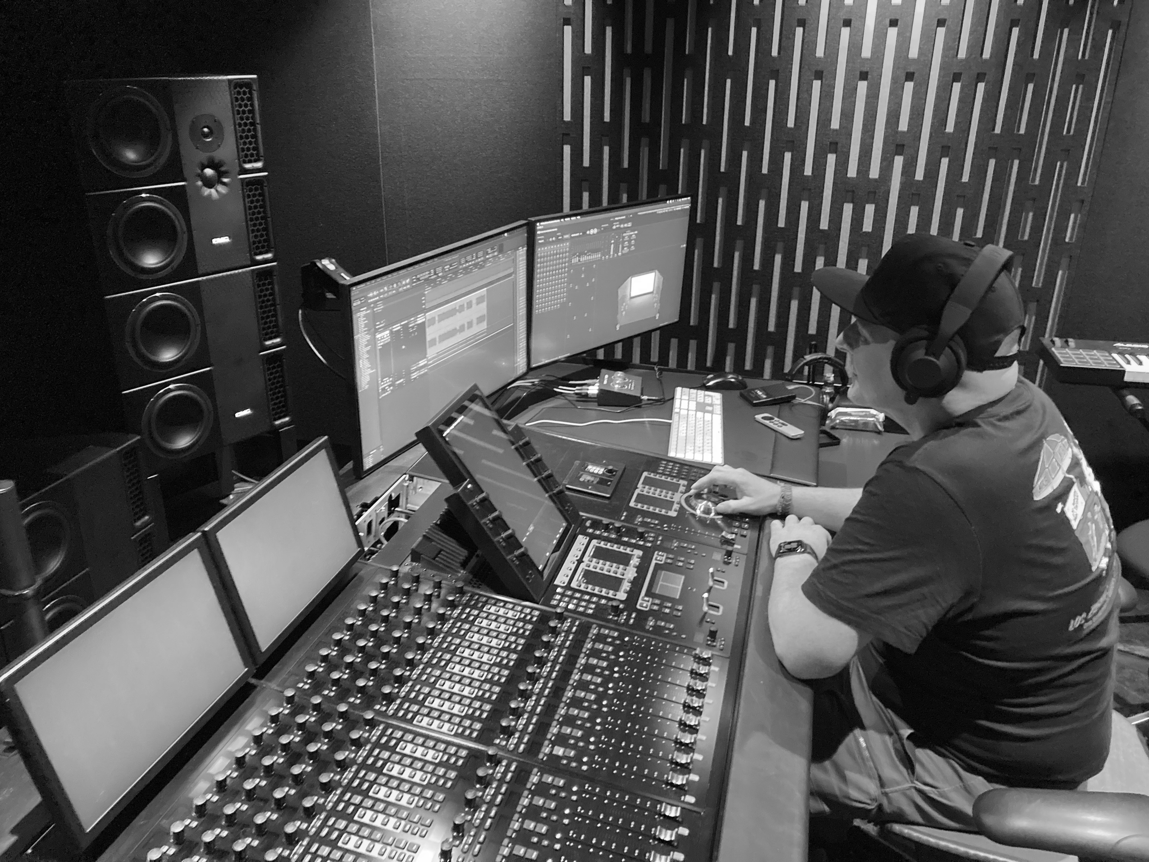 Using a Digico sd11 mixing desk I generate a mix of show, Comms and a solo buss. Mixing on headphones rather than speakers gives me greater isolation from the room when monitoring tracks as they play out.